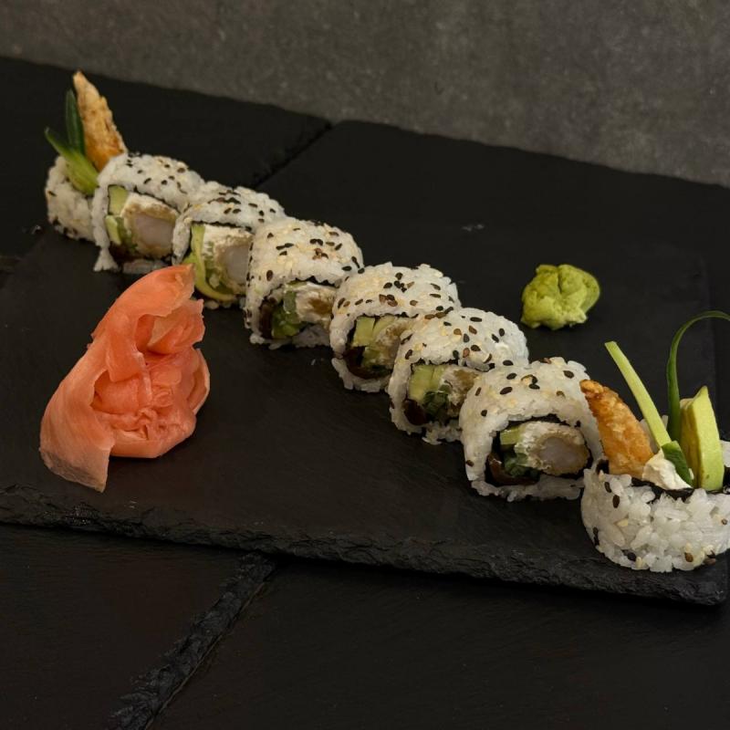Krewetka w panko, phila, ogórek, awokado, tykwa marynowana, sezam, spicy mayo, ryż, nori.