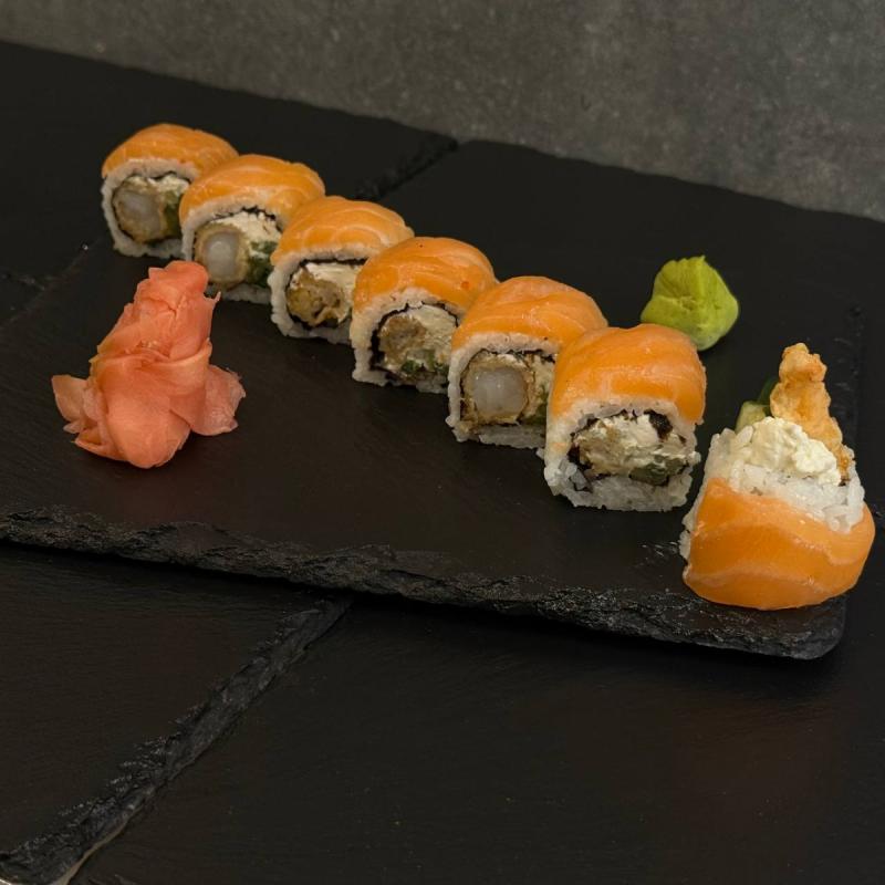 Krewetka w panko, łosoś, ogórek i ser, ryż, nori.